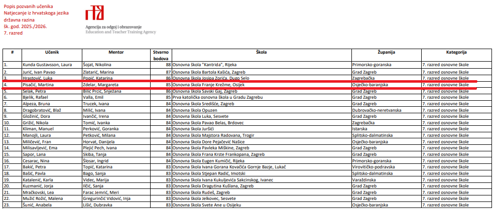 Naša učenica 7. b razreda Martina Pisačić pod mentorstvom profesorice hrvatskog jezika Margarete Zdelar pozvana je na državnu razinu natjecanja iz hrvatskog jezika za školsku godinu 2025./2026. koje će se održati u Crikvenici u razdoblju od 13. – 15. svibnja 2026. godine.